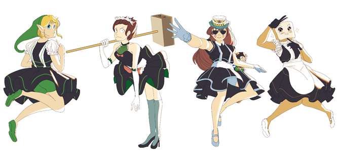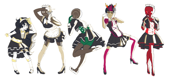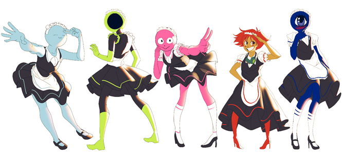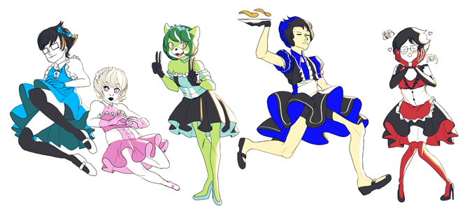 Today was pleasant and relaxed. I set a plan into motion earlier this month that finally came to fruition: Sozzay is a fairly well-known artist in our community, with her style being developed and very pleasant to consider. She actually has, completely unbidden by us, made a set of pictures depicting the entire mod team circa the beginning of July last year as maids, as one might find in a maid cafe. This was delightful for many of us, although some—such as WoC—were less pleased. The pictures follow: