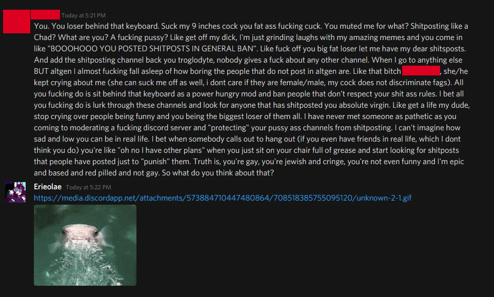 The account in question has also started posting images with names censored, although this is hampered by the fact that literally anyone can join the server at anytime and search through its archives instantaneously. Tera noticed this and discovered it had been included in a post (although it was not actually the subject), celebrating: “THATS ME / IM IN THE CALLOUT” (although it’s since determined that the person in the post was actually Wheals). Others have been similarly irreverent to the criticism, soaking in the ironic glory of being called out.