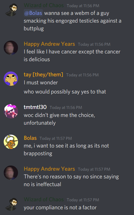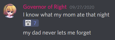 Meat was where more serious channels went, specifically the Interests category. Everyone in those channels was expected to dwell under the rule of an iron fist, and at the first sign of dissent they were removed. Additionally, Jman created a bot for the day that checked all of the messages sent in #meat and muted people for increasing intervals of time if they sent a non-unique message (for anyone familiar, these are /r9k/ rules). Channels in candy, including the Creative category and the newly created #roleplay, were full of frivolous bullshit that had very little real moderation. In theory at least, no one was allowed to see both categories, and would be forced to stick in their chosen “timeline” all day unless banned.