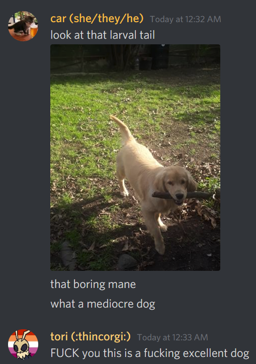 This contrasts heavily with claims that we are “a stomping ground for bigots and bigotry behavior… literally doing nothing to protect the homestucks in their fucking server” and exhibiting “rampant racism, homophobia, transphobia and genuine shittyness towards anyone who doesnt fit their agenda” (not linking the owner so as to protect their identity). The hypocrisy in that tidbit about excluding people who don’t fit with agendas would be delicious if I didn’t think it was completely unaware of itself.