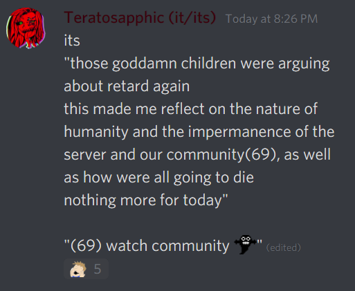 A huge element of that distaste comes from their casual flair for insulting individual users using derogatory language (which, I must stress again, has not really been an issue for a while). This caused us to review our policy with the usage of the word “retard,” which has been a subject of repeated debate over the last so many years. It’s been massively complicated due to the fact that it’s used liberally within Homestuck proper, and due to a rather pronounced degree of inconsistency in how mods treat the issue. We’re all pretty tired of this debate, and after so long we were somewhat able to obtain a consensus. Despite WoC being at the center of this controversy, Makin followed up on an obtuse tradition and gave him the final say in this matter.