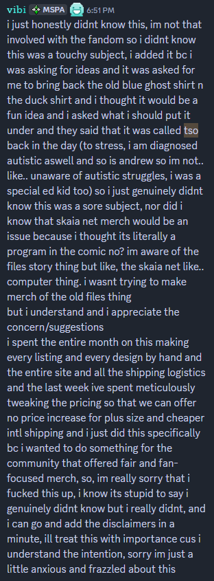 This has obviously come with issues: slow mode is back in play for #homestuck and #general for now. A related problem is retaliation against Gio’s article: as insane as it seems, plenty of people are harassing him for various frivolous offenses such as misgendering Hussie, which by his own admission should not be possible (Hussie has stated that he does not care what pronouns people call him by, although in every legal dealing with his lawyers Hussie has been referred to strictly as male). With the general increase in activity and negativity reigning, some disgruntled people from Bluesky and elsewhere have been raiding this server as a result. Given events earlier this year I’ve promised to stay out of mod affairs except for emergencies, which this seemed to count as, and thus after volunteering I’ve been given mod status again to ban raiders. I think I may have come in after the excitement is already over, but it’s nice to be helping again.