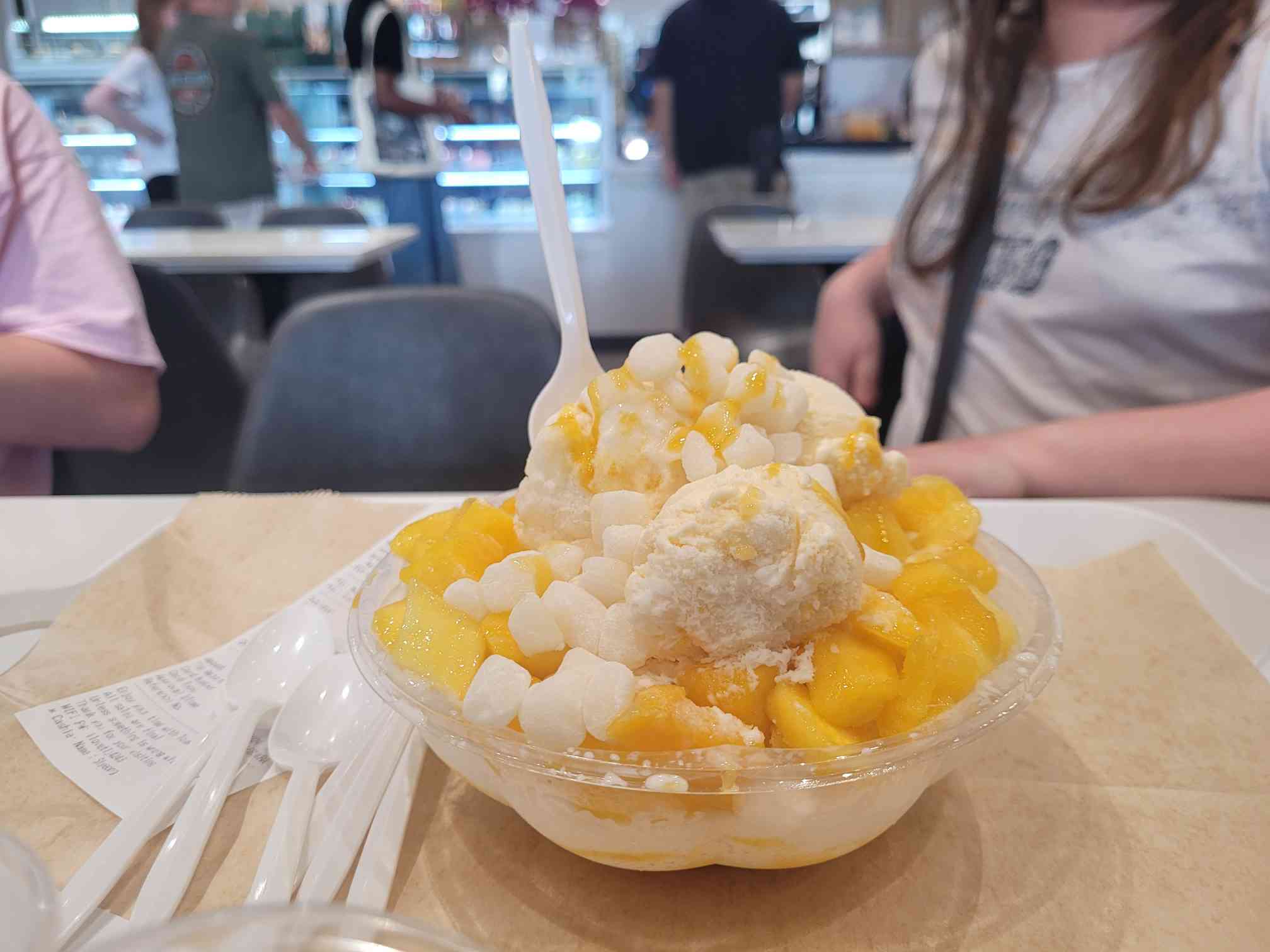 We ended up getting multiple helpings of spicy beef bulgogi and I honestly could have kept going for fucking hours, it was delicious. Mint also got us all some mango bingsu, a shaved ice milk dessert, to share from a nearby bakery called Tous Les Jours.