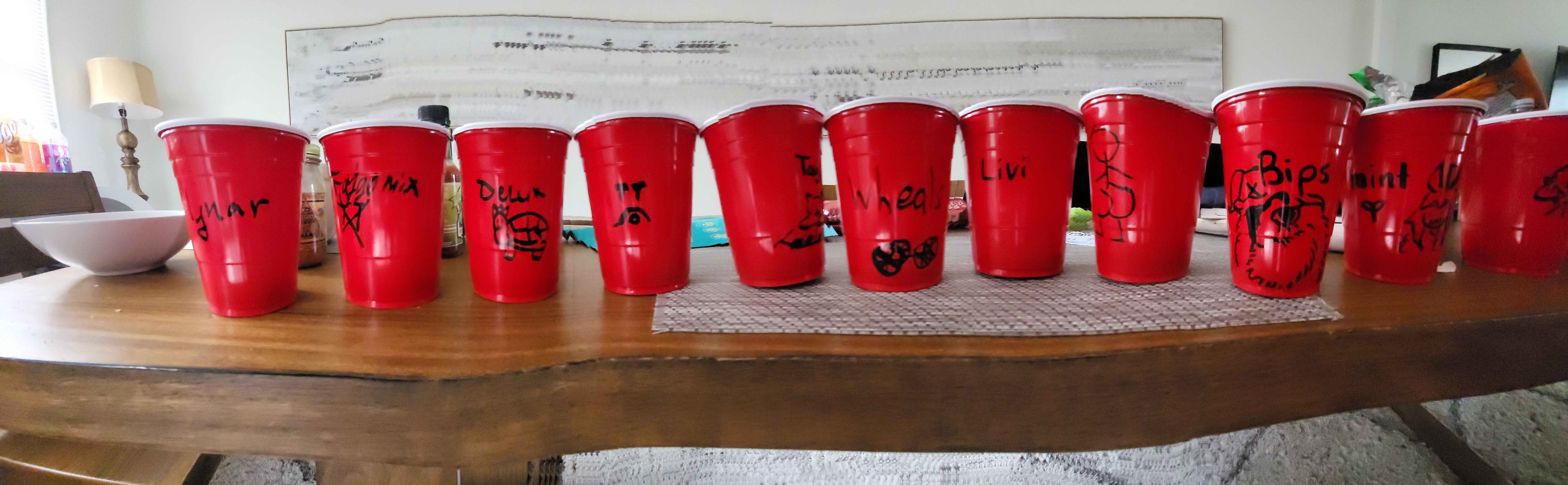 We also pushed ahead our cooking schedule so that Lime cooked some delicious enchiladas instead of doing it the next morning. The rest of the night was spent chatting amicably with people or playing pool, along with a hefty amount of drinking, which was enabled by a truly preposterous amount of all manner of liquors including TWO fifths of Wild Turkey 101. Mint decided to label everyone’s cups in order to avoid losing them or cross-contamination, and drew a little picture of their choice under their name. Here are a couple pictures of what we could find at the end of the trip: