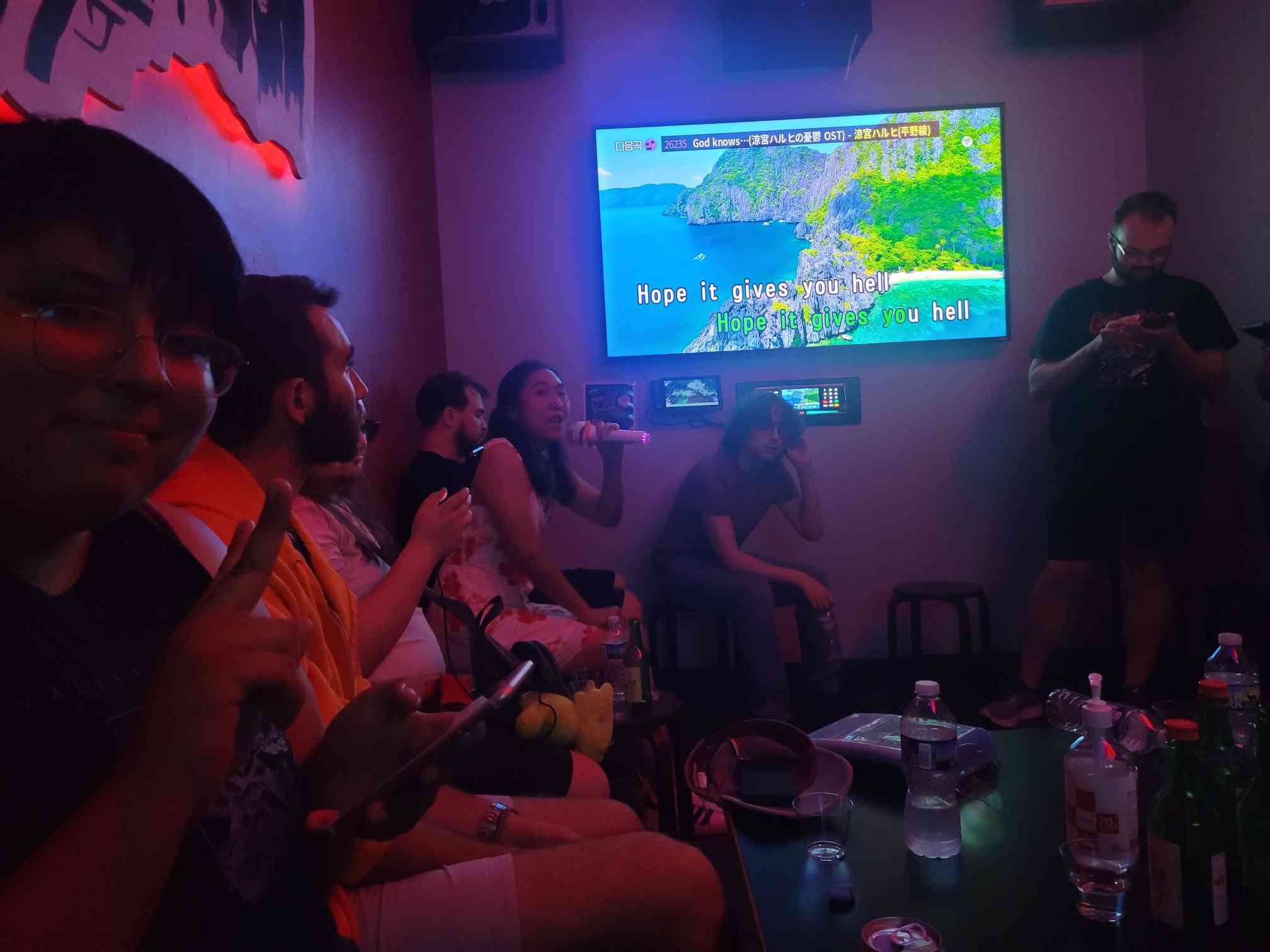 Shortly after that we all took off for karaoke. Last year was the first time I’ve experienced such a thing and it was an incredible time, somehow Mint managed to book the exact same room we had last year. I didn’t describe the place itself back then, but the business is divided up so that there’s a lobby with fridges that you can freely purchase water, soju, and beer from (they are tacked directly onto the room charge). There is a hallway bedecked in random art of certain Marvel characters, such as Captain America in the men’s restroom, and a bunch of other bullshit I can’t recall now. This hallway forms a square connected at one corner to the lobby, with rooms all along the perimeter and the inside of the square. I would say in all there’s about 8 or 9 rooms of various sizes, and we got one of the biggest available.