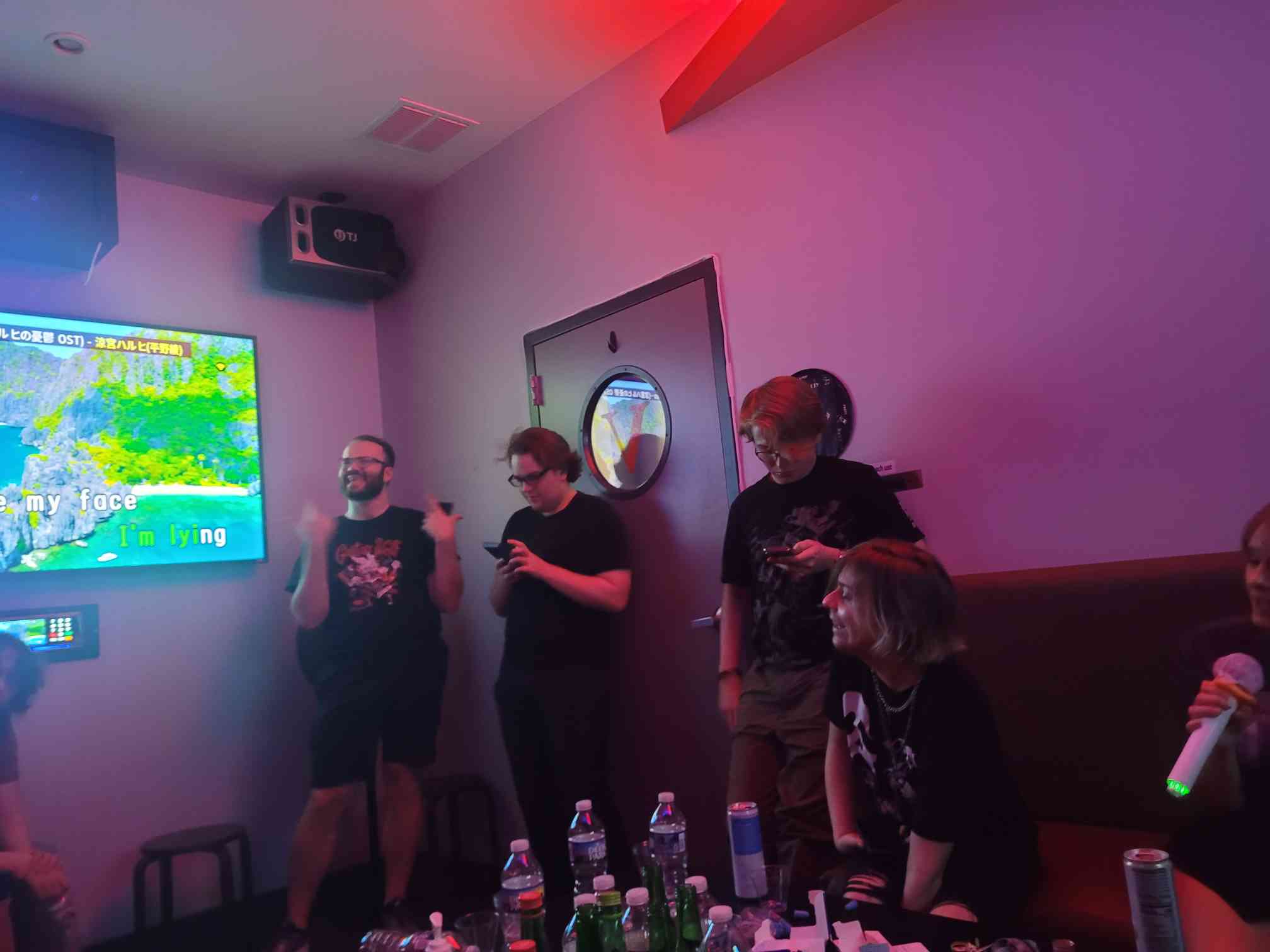 Karaoke started off a bit slow, we brought along the maximum allowed 20 people which included anankeAverted and her partner, terminalTermagant, and lupoCani, but they left early in order to spend their first meeting talking rather than singing. As they opted for the airbnb, Faeby appeared for the first time to sit alongside Nut and Ifnar, and as incredible offerings of soju appeared on the karaoke table we started to get rowdier. I did Sweet Caroline by Neil Diamond, which if I’m not mistaken I did last year as well, and by this point I was yelling full belt into the microphone. We finished off with Bohemian Rhapsody, ever-rousing, and then headed back to Otahouse to hang out some more. At this point the evening separated into two halves: people chatted and played video games upstairs, and people downstairs played pool. Much of what we did at Otahouse involved pool, both the billiards and swimming varieties.