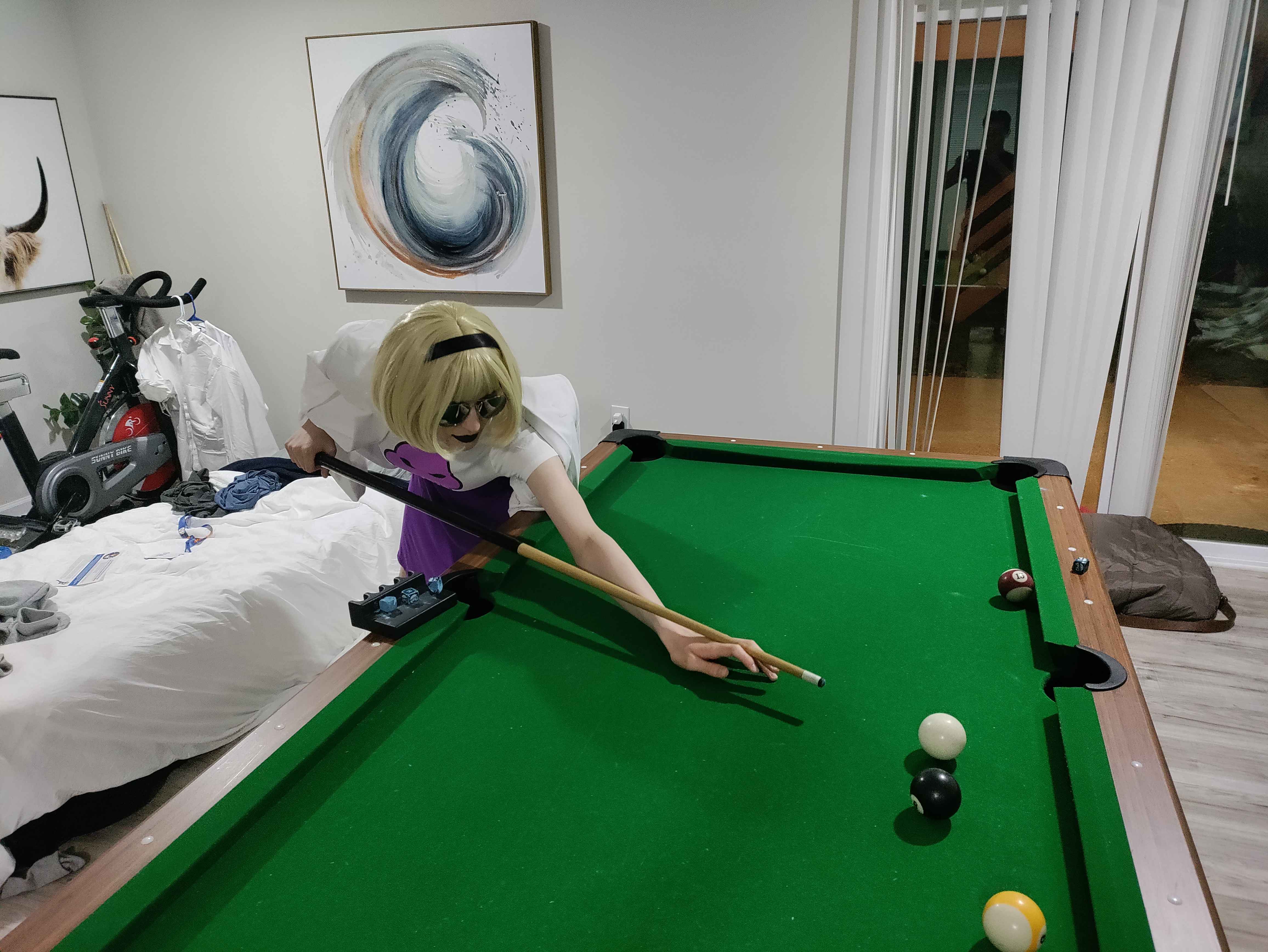 The rotating groups consisted mostly of terminalTermagant, lupoCani, anankeAverted and her girlfriend, Tay, and a couple others. I remember at some point I taught everybody how to play a less common game for pool tables called Cutthroat, which is intended to be played with three players instead of two. I’ve tried to show this game to people a few times before and it never catches on for some reason, so after playing the first game I rotated out and hustled upstairs for some refreshments, expecting it to be abandoned in favor of regular ol’ billiards. Imagine my surprise when I came back downstairs like three hours later3 and they were still playing fucking Cutthroat. Oddly delightful for such a grim sounding game.