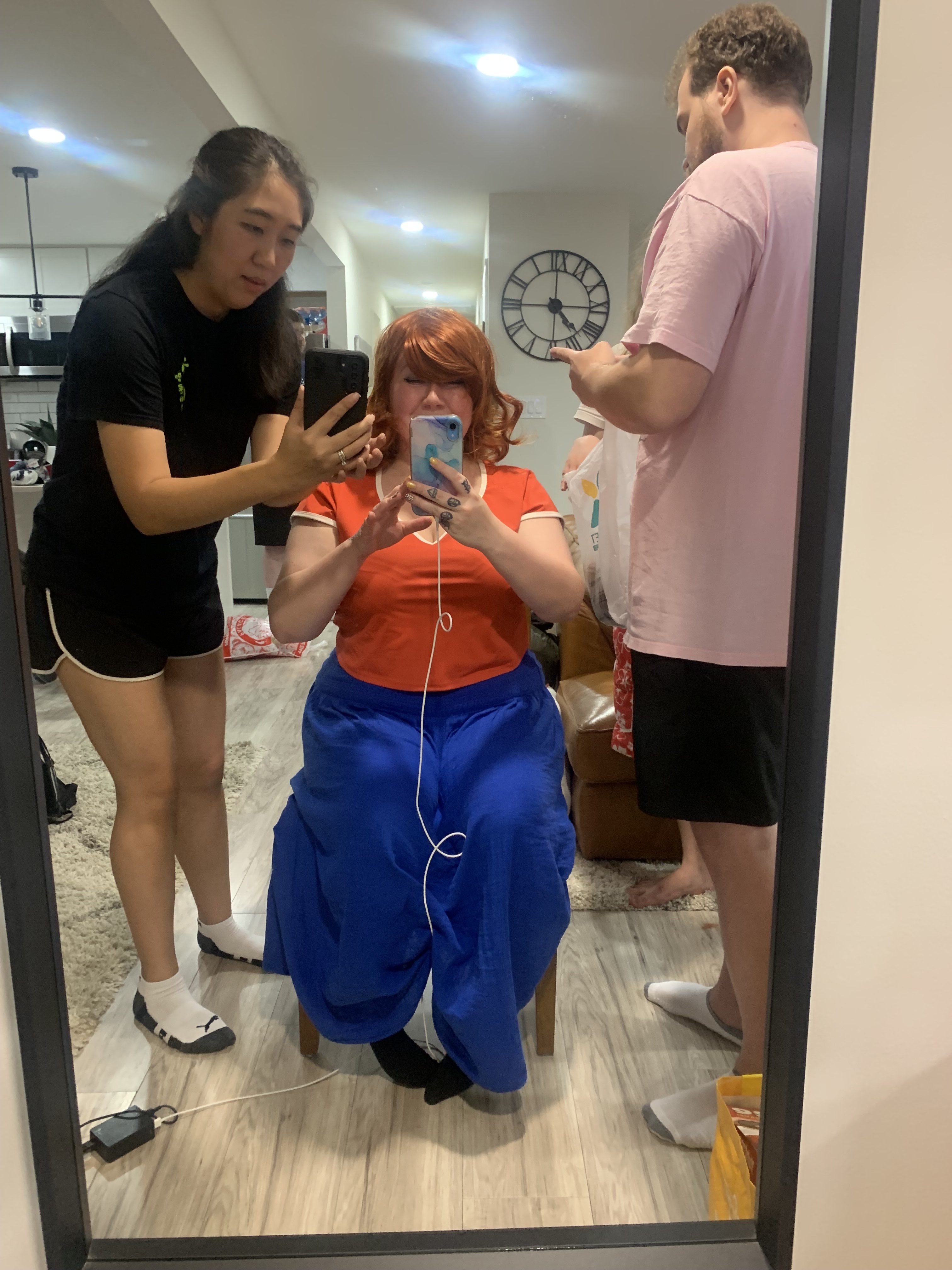 Mint and Misha helping Nut to style a wig for a cosplay.