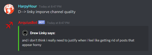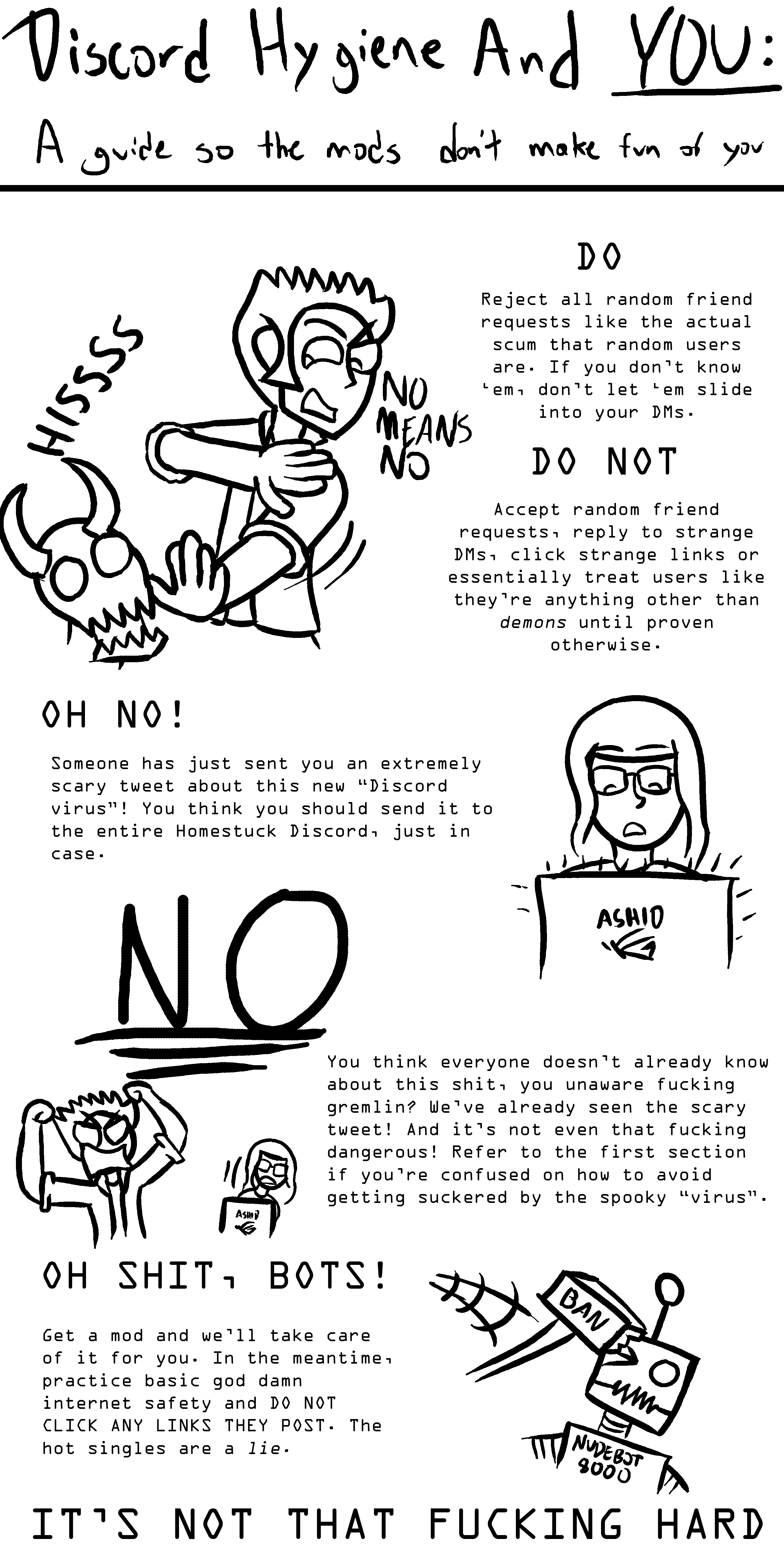 The channel #general is easily the one I use most besides #mspa-lit, and I noticed they also have a storage issue. I have access to the stored messages and can search for antiquated pins from the beginning of the server up through the end of 2019. However, the culture was different and it seems there is a LOT to go through, and most of it appears to be either inscrutable, currently deleted, or worthless. For now, this archive only contains the ones that are immediately available in the pin list right now and through Neth's Imgur album.