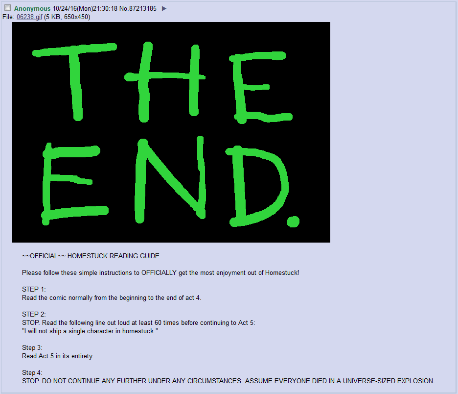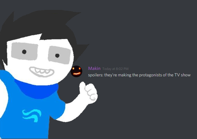Fuck you dude, I've been trying to avoid spoilers as much as possible from CaNWC so I could watch it with my friend when he comes back; but apparently I can't even avoid it on a totally irrelevant subreddit HERE. I'm not even going on MSPFA because jackasses don't know how to stop spoiling shit in their thumbnails or names; but SOMEHOW