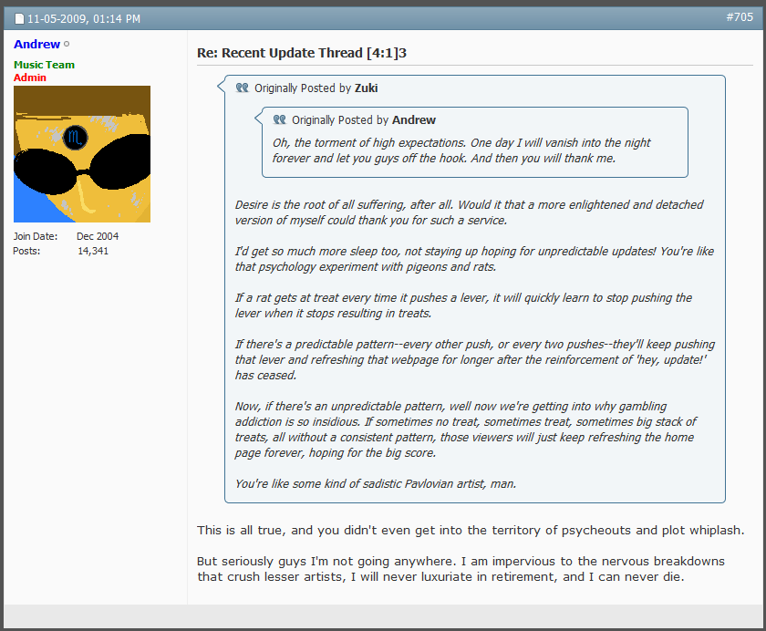 An enormous thank you to MrNostalgic for his assistance in acquiring profile pictures and name colors for this page. Additional thanks to Jman005 for his archival of mspa-lit over its first three years which helps in finding old pins that have since been lost, and to Niklink, MrCheeze, and Wheals for helping me sift through old pin messages to more accurately determine what to add to this archive.