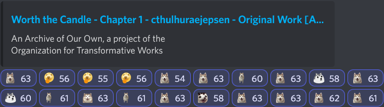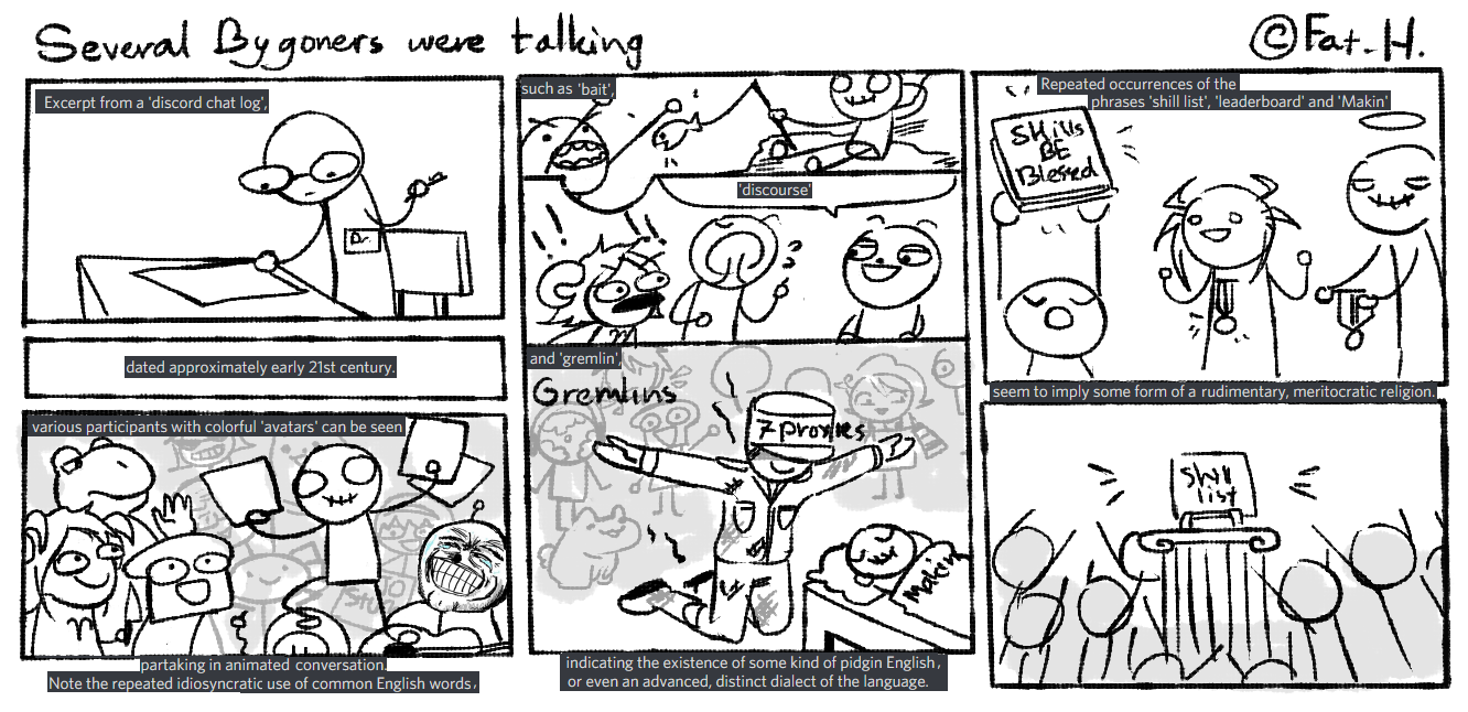 Excerpt from a 'discord chat log', dated approximately early 21st century. Here various participants with colorful 'avatars' can be seen partaking in animated conversation. Note the repeated idiosyncratic use of common English words such as 'bait', 'discourse' and 'gremlin', indicating the existence of some kind of pidgin English or even an advanced, distinct dialect of the language. Repeated occurrences of the phrases 'shill list', 'leaderboard' and 'Makin' seem to imply some form of a rudimentary, meritocratic religion.