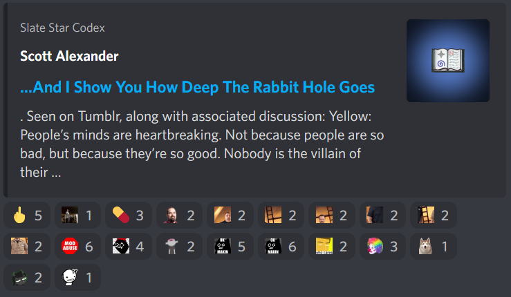 reactions from people who have finished this story FOR THE FIRST TIME https://slatestarcodex.com/2015/06/02/and-i-show-you-how-deep-the-rabbit-hole-goes/ in order to unlock the channel, good luck