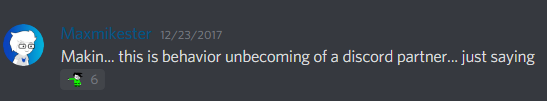 Lyranea, a former server regular, had tried to invite Makin to her personal server. He responded by asking why he would want an invite to “a gay baby jail”. Maxmikester, the hero of this story, called out Makin’s verbal abuse with a line that would live on in infamy.