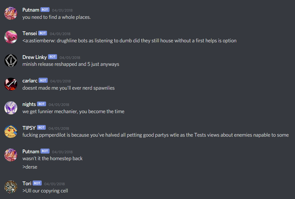 From eyewitness accounts and my own personal observations trawling through the backlogs, early Altgen was a hellish lawless place where the only hard rule seemed to be no NSFW, counting numerous cases of spam, bot abuse, obnoxious text quirks among its many attractions. I'm not sure exactly when, but perhaps after the changeover in pseudomodship from the first mod to Tori, the channel began to quieten down to a mere dull roar of complacent friendly shitposting, rather than a maelstrom. Evidently there was a lot of insufferable behaviour and raiding happening around this time, as it got bad enough to warrant the first of many supplementary rules to be added to the pins. Eventually in November 2017, Tori stepped down from the Altgen Pseudomodship and Dingus was promoted in her stead.
