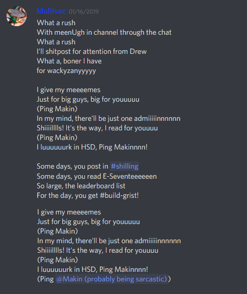 Pinging Makin: The idea of pinging Makin has become a meme for the idea that pinging Makin for dumb reasons will get you permabanned, and that anyone who pings Makin is a badass. While the real punishment is likely not going to be harsh if the ping was important/was for an amusing reason, pinging Makin for stupid reasons is still a very bad idea.