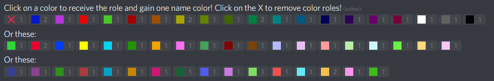 For an extended period of time, Makin was vehemently against the idea of a formal rules channel, believing codifying hard, server-wide rules to encourage rule skirting and defiance. For reasons I personally don’t remember and am unsure I’m at liberty to say, he was pressured into converting #welcome into #welcome-rules, which said everything the #general description said in a cool and new place. It also allowed the implementation of a new function from the secondary server bot, 72. Reacting to a colour-coded emote (see below) would grant you the colour role associated, instead of needing to use a “giveme” command. This roughly (read approx. 1-2 month span) coincided with the introduction of a plethora of new colour roles, which were all variants on the pre-existing name colours.
