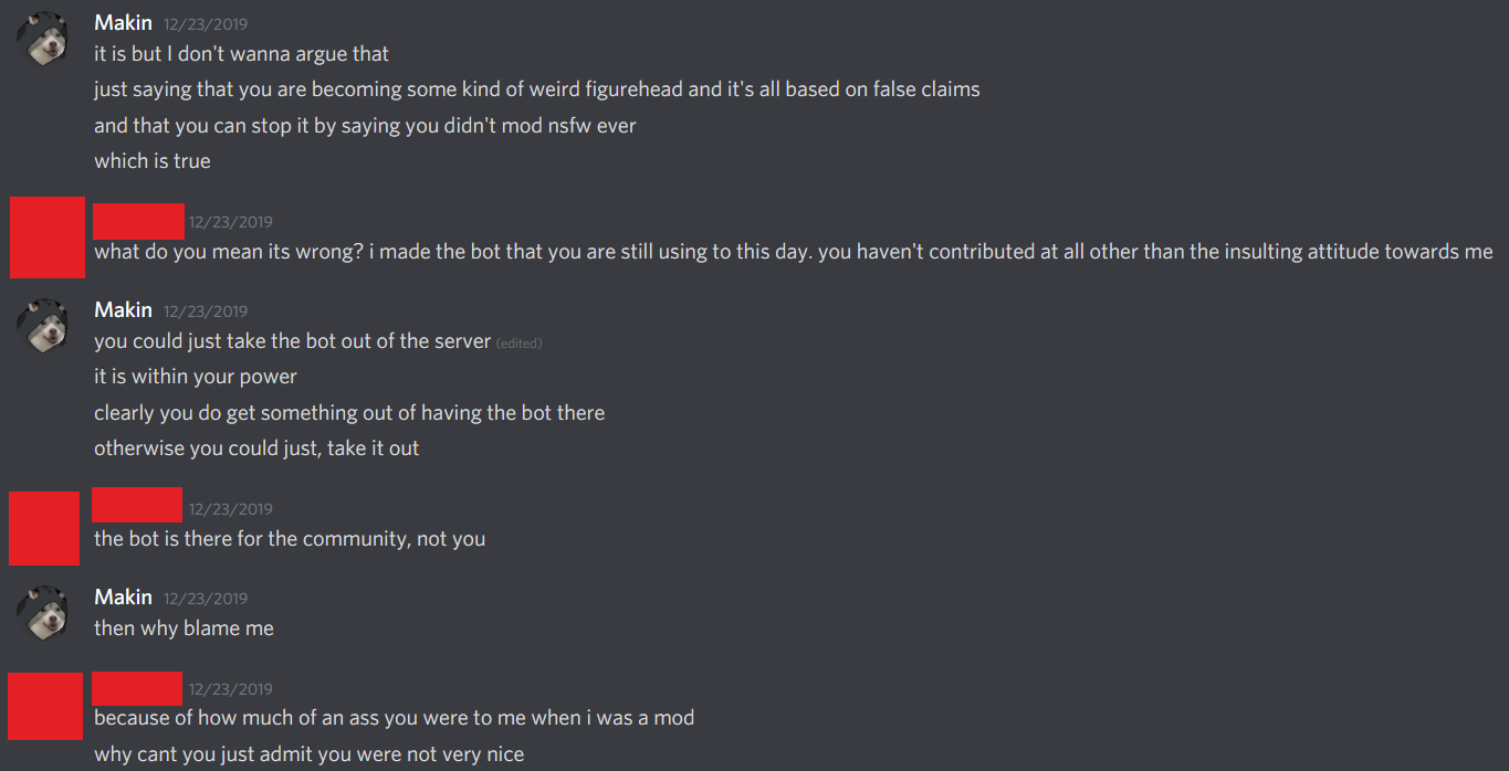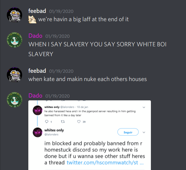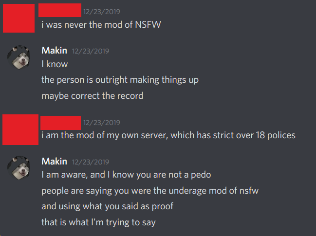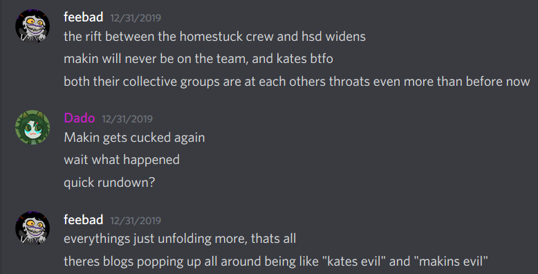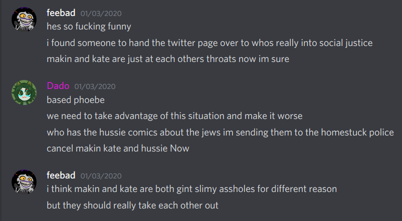In late December of 2019/ early January 2020, the user Phoebe is banned from the HSD for harassment and racism towards other users. She devises a plan to foment discord between the official team and us in an effort to get Kate and Makin both in trouble (see screenshots below). The plan succeeds, and an enormous confrontation begins. Alongside lambasting Makin for releasing “homestuck.net,” an extensive fan archive Makin developed, Kate and people surrounding her on Twitter accuse the mod team and communities of the HSD and Homestuck subreddit of harboring child abusers and being “a child porn ring.” Kate is banned from the Homestuck subreddit for this. Hussie reaches out to Makin over this and to try and smooth matters over.