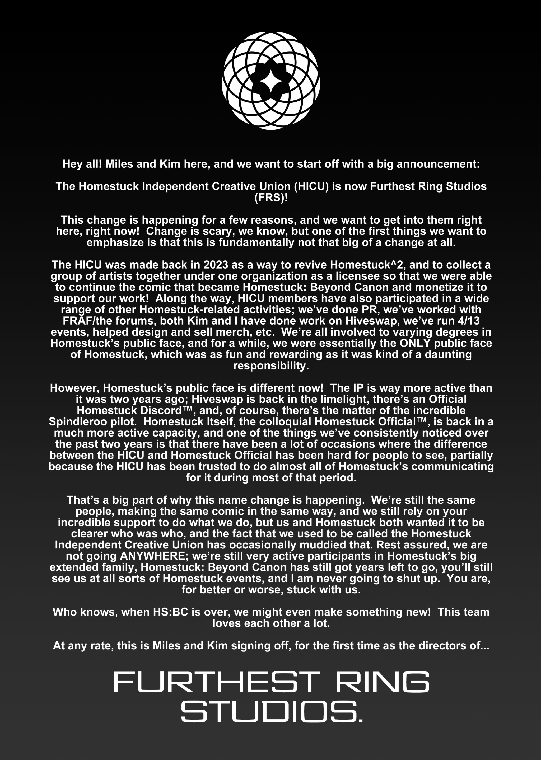 I went through four years for the most part like this, casually engaging in the Homestuck community if at all, mostly just focusing on doing my school work or actually working. Homestuck itself was experiencing some extremely big gaps in the serial format; it went an entire year without any updates at all from October 16th of 2013 to October 17th of 2014, and then experienced numerous halts and stutters from there to the end. By the beginning of 2016, it was clear that the comic was drawing to a close. There were faint rumblings that even I in my isolated state was not immune to—this giant of a story was approaching its end.